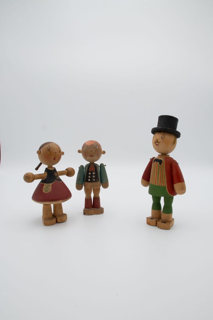 <写真>カイ・フランク《テュット(女の子)》(左)、《ポイカ(男の子)》(中央)、《シルクスティレヒトーリ(サーカス座長)》(右) 木製人形 1945年