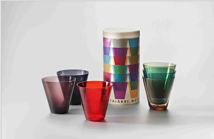 <写真>カイ・フランク《キマラ(カクテル)》タンブラー 1953年、《トイヴェ(希望)》パッケージ 1955年 ヌータヤルヴィ・ガラス製作所