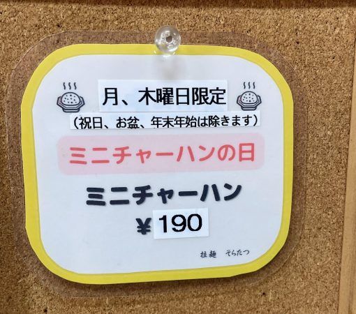 そしてなんと! 月・木曜限定で、ミニチャーハンが190円で食べられるそうです。 チャーハンも人気だそうで、次回はぜひ注文したいと思います!