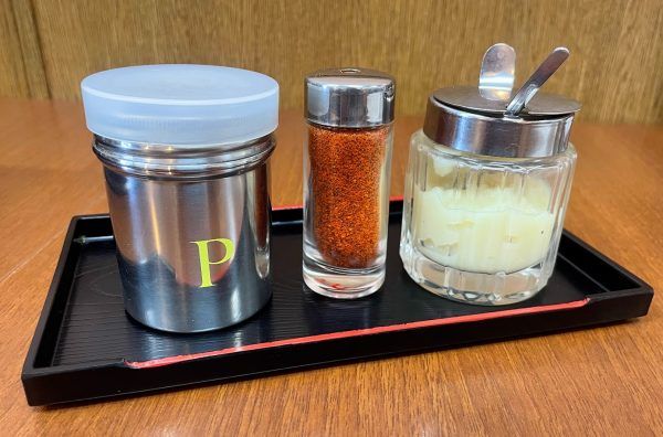 トッピングはコショウや七味唐辛子、そしてニンニク! 味変を楽しめますね~♪