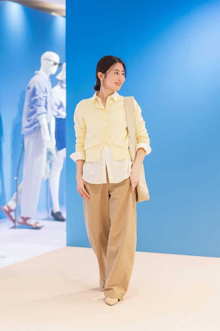 「私が手に取ったのはイエローが春らしいこちらのカーディガン。同色のリネンシャツを重ねてグラデーションコーデにして、鮮度高めのおしゃれを楽しみたいです。バレルレッグシルエットのワイドパンツはベージュをチョイス。小物もベージュ系で統一し、イエローが活きる柔らかトーンでまとめました」