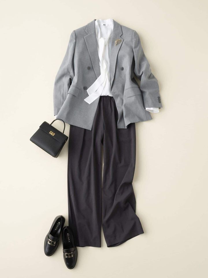 何を着ていけば良いと悩む学校行事は、コンサバな黒パンツがベスト。どんなアイテムにも左右されずブレないビジュアルが、コーデをシックに仕上げる土台として活躍してくれます。ジャケットは、あえてこなれ感のあるグレーでオフィススタイルとのメリハリをつけるのが◎。