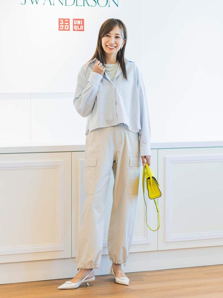オックスフォードシャツ/ストライプ¥3,990 ミニT ¥1,990 カーゴパンツ¥4,990(すべてユニクロ アンド ジェイ ダブリュー アンダーソン/ユニクロ) ※すべてMサイズを着用 靴、バッグ(ともに私物)