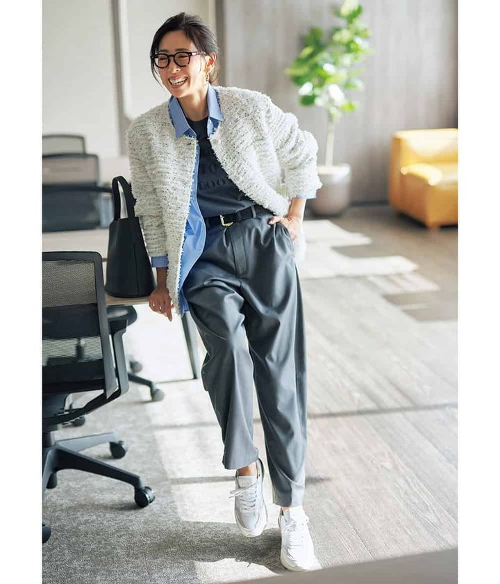 オフィスに選ぶなら、カーデ感覚では折れるツイードの軽ジャケットが重宝します。Tシャツとシャツをレイヤードしたリラックス感のある着こなしも、きちんと感を出しながら親しみやすい雰囲気に。