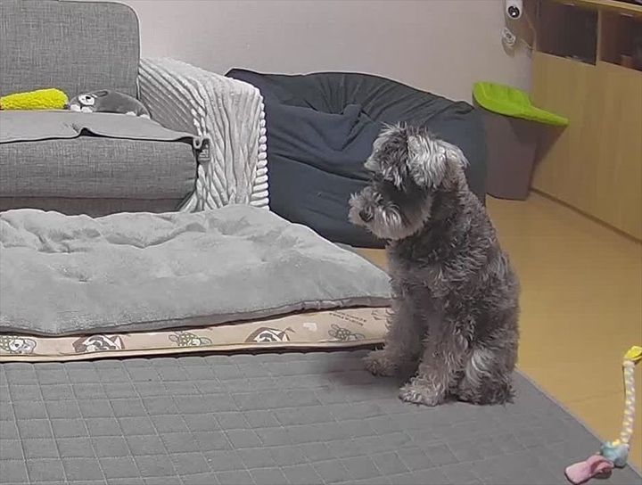 3. 急いで帰らないと!座っているいじらしいミニチュア・シュナウザーに「かわええ~寂しかったんやね」「お腹をたくさんさすってあげて」