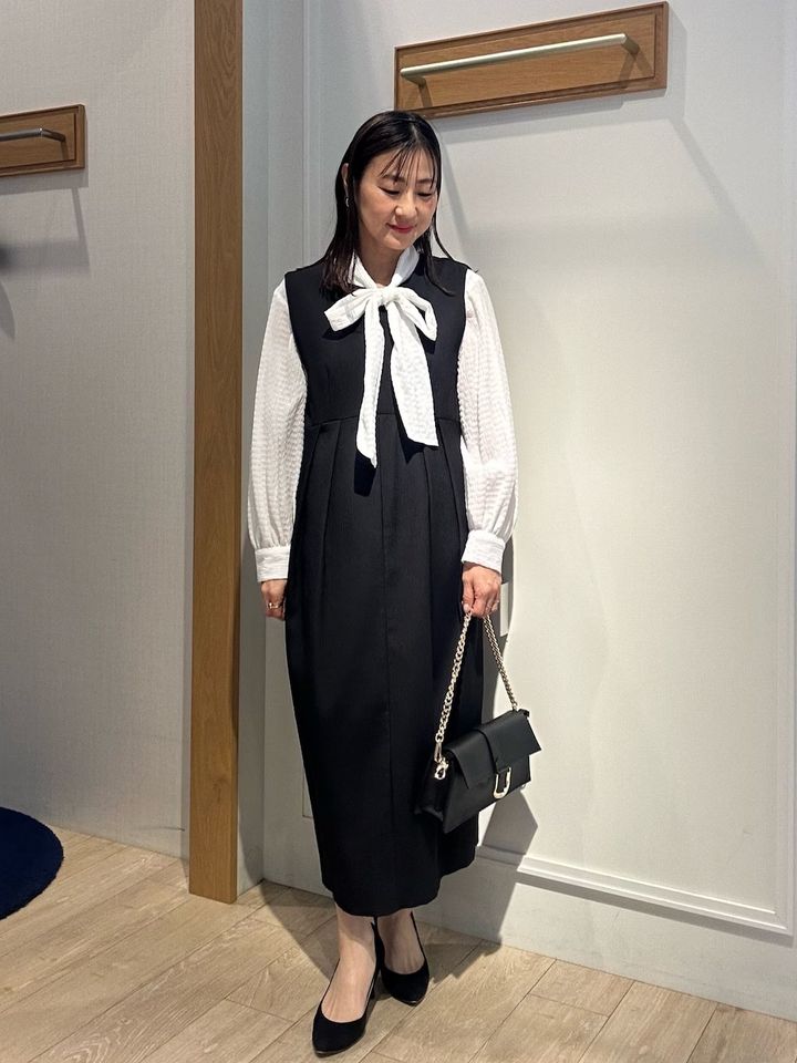 こちらではインナーに白のボウタイブラウスを着用。首もとで結んだリボンが、顔まわりを華やかに見せてくれます。
