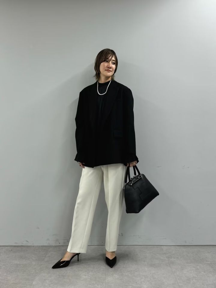 また、ブラックのブラウスにはパールのネックレスが映えて、目線を上に集めてくれるので、全身をすらっと見せてくれる効果もあります。普段はもちろん、セレモニー時などにもおすすめです。