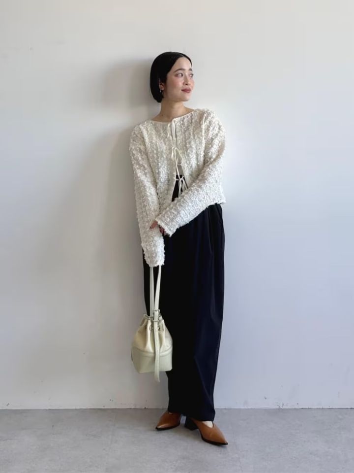 そしてボトムスには、コクーンシルエットのタック入りテーパードパンツをチョイス。丸みのあるボトムスのシルエットはブラウスとも相性がよく、パンツコーデでもほんのり甘さが感じられるので、フェミニン派の方にもおすすめです。