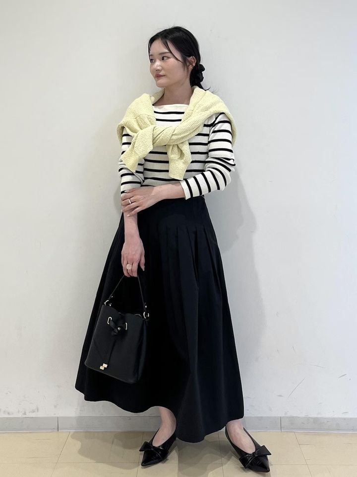 ボーダーのニット&フレアスカートというベーシックなアイテムも、このシルエットならカジュアルになりすぎず、エレガントな雰囲気に仕上がります。
