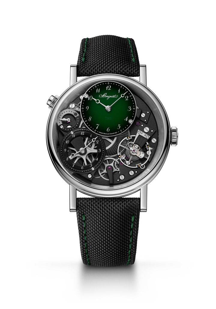 GMTモデル“トラディション GMT 7067”は、40mmのプラチナケースに、深みのあるグリーングラデーションのグラン・フー エナメル文字盤を採用。中央の濃いグリーンから外周の漆黒へと変化するグラデーションは、熟練のエナメル職人の高い技術によって実現したもの。またGMT表示も、後にタイムゾーンとして定義される時差を1800年代初頭に高精度で克服した初代ブレゲにゆかりのある機構です。