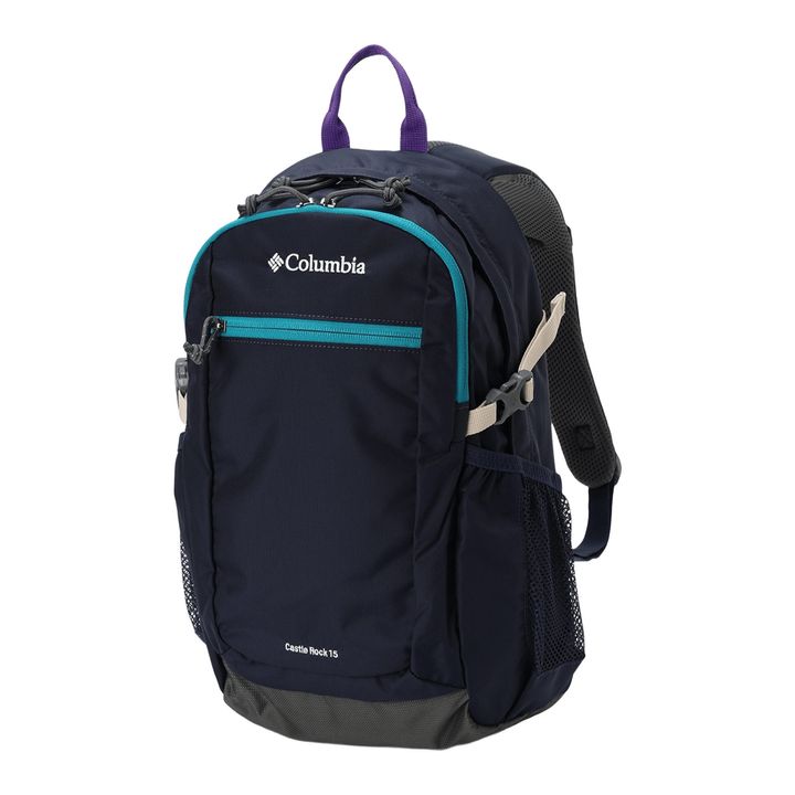 日帰りハイキングからタウンユースまで、さまざまな用途でマルチに使えるバックパック。豊富なカラバリのなかから、ネイビーを基調にしたデザインをリコメンド。パープル&ターコイズブルーの差し色で、トレンドのレトロアウトドア風の佇まいに。