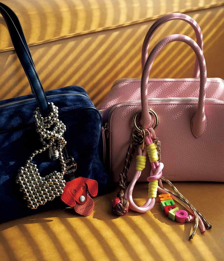 〈右〉ピンクバッグ¥53,900(ヴァジック/ヴァジックジャパン) バッグチャーム¥9,900(ヴィアメイルバッグ/ティースクエア プレスルーム)〈左〉ネイビーバッグ¥38,900(トゥティエ) ドッグキーリング¥22,000(ロンシャン/ロンシャン・ジャパン) ハートネックチャーム¥3,960(シー ユナイテッドアローズ/ユナイテッドアローズ カスタマーサービスデスク)