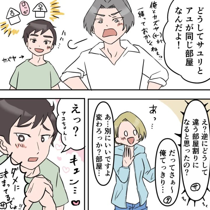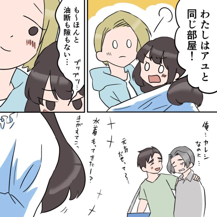サユリは「わたしはアユと同じ部屋!」と私に抱きつくと、「ほんと油断も隙もない・・・」とムッとした表情で小言を言いました。落ち込むタクマさんには申し訳ないけれど、彼氏よりも私を優先してくれたことが、なんだか嬉しかったです。