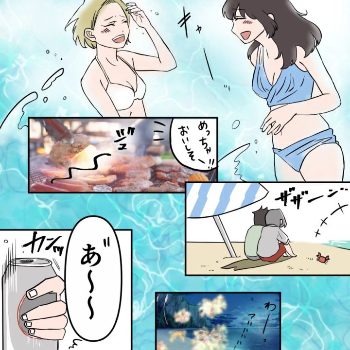 その後は、海で遊んだり、バーベキューをしたり、花火を楽しんだり・・・私とサユリは、思う存分はしゃいで楽しい時間を過ごしました。一緒に来たタクマさんとカズヤさんのことはすっかり後回し。2人で夢中になって遊びまくります。そうして気づけばあっという間に時間が過ぎ、辺りはすっかり暗くなりました。