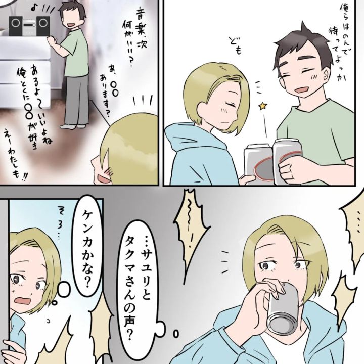 でも、もう2人は恋人同士だし、今さら気にしても仕方ない。私は気にしないフリをして、カズヤさんと2人でサユリが戻ってくるのを待つことにしました。好きな音楽を流しながら過ごしていると、かすかに怒鳴り声が聞こえてきます。「サユリとタクマさんの声?ケンカかな?」そっと隣のロッジをのぞくと・・・