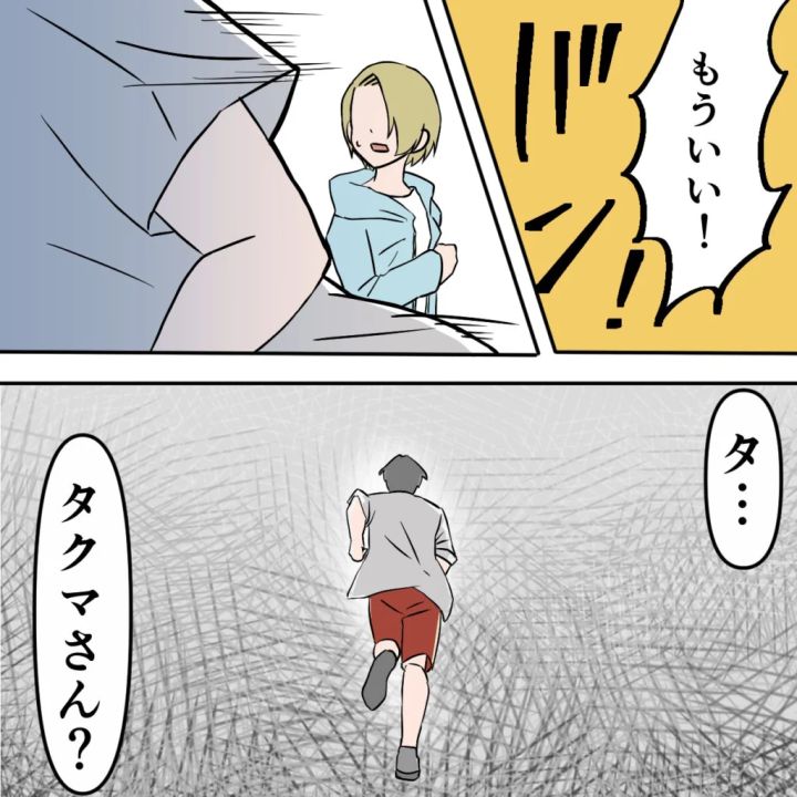 「もういい!」という大きな声と同時に、タクマさんが走り去る姿が見えました。さっきまであんなに仲が良さそうだったのに、2人の間に一体何があったのでしょうか。