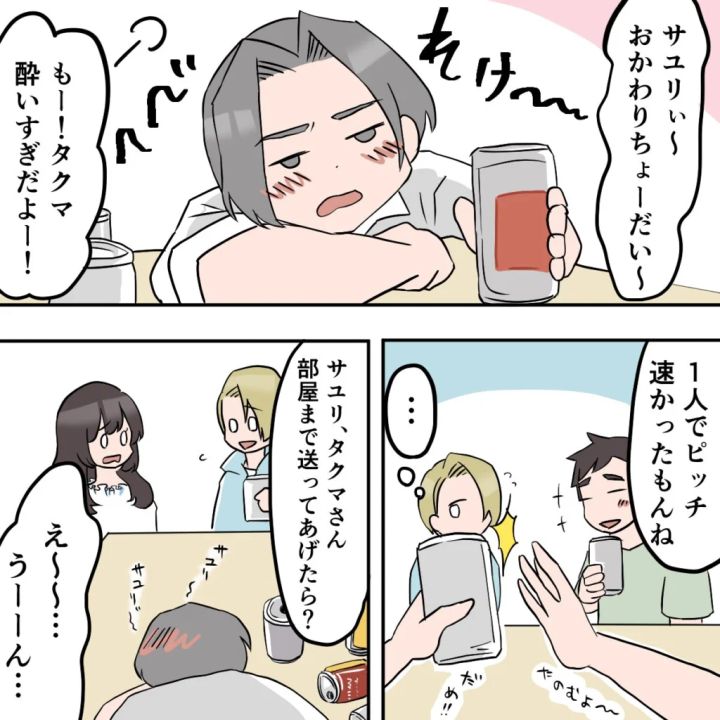 「サユリ~おかわりちょ~だい」と、すっかり出来上がった様子のタクマさん。「もう!飲みすぎだよ」とサユリが注意しても、まだ足りないと言わんばかりにおかわりをねだります。さすがに心配になって、私はサユリに「タクマさん、部屋まで送ってあげたら?」と声をかけました。
