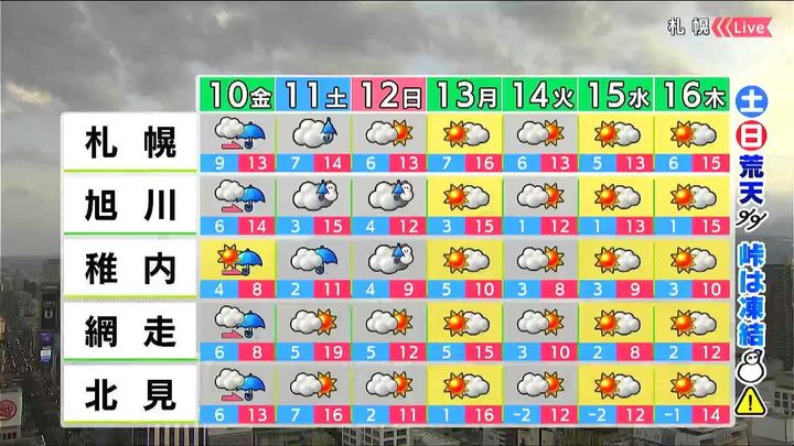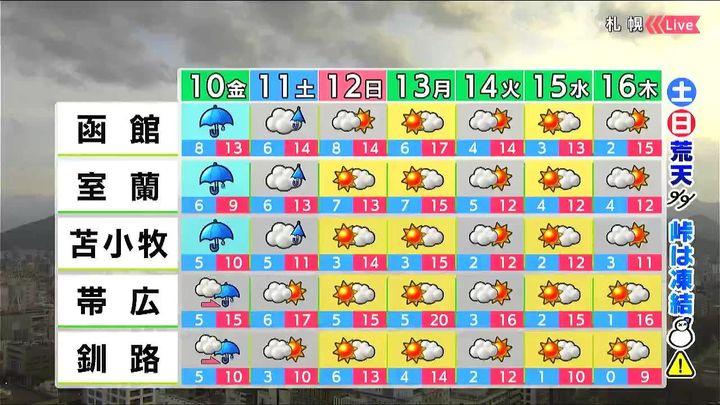 午後を中心に雨や風が強まるでしょう。最低気温は6度前後で、札幌は9度です。最高気温はきょう9日(木)ほどではないものの、平年より高い状態が続きます。なだれや土砂災害、河川の増水にも注意してください。