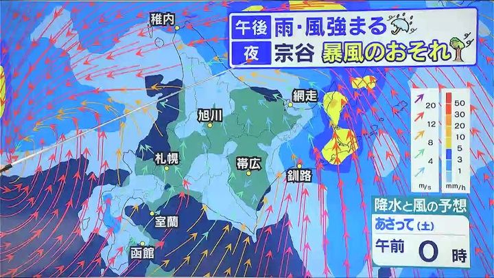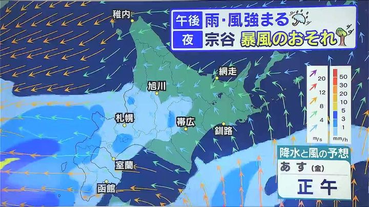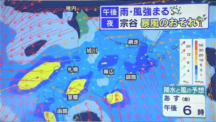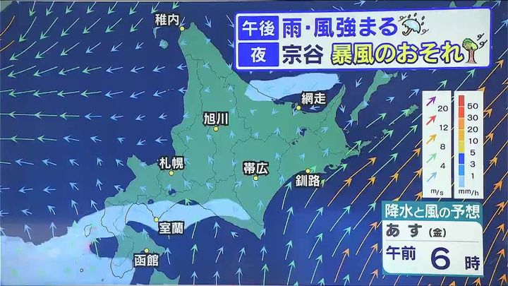 あす10日(金)午後は全道的に雨が降り、傘にバチバチと音を立てるほど降り方が強まり、太平洋側などでは南風も強まります。夜は宗谷地方で再び、警報級の暴風となるおそれがあります。