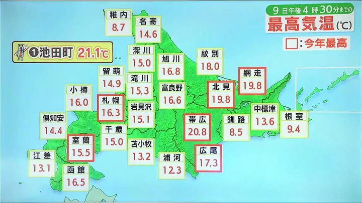 きょう9日(木)は風が強まり南風で暖かい空気が流れ込みました。そして日差しと、暖かい空気が山を吹き下りるフェーン現象の影響も加わり、午後4時半までに十勝中部の池田町で21.1度まで気温が上がりました。帯広は今年初の20度以上、札幌は今年初めて15度以上、16.3度と暖かくなりました。