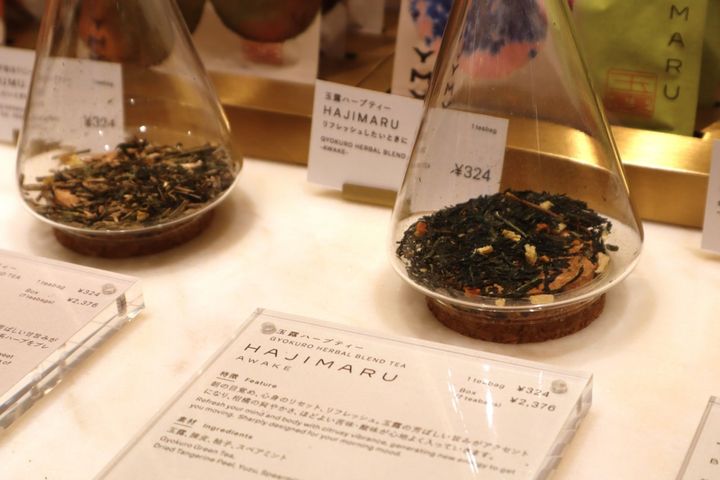 店内に入ると、ブランドが提案する「製法や産地といった知識だけで選ぶのではなく、その日の気分や直感で選ぶ」というお茶の楽しみ方の通り、玉露ハーブティー&玉露雁が音ほうじハーブティーがずらり。玉露とハーブやスパイスなどの自然素材をブレンドして作られた多彩なお茶を好みに合わせて選ぶことができます。