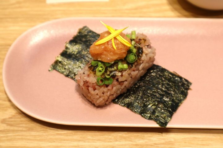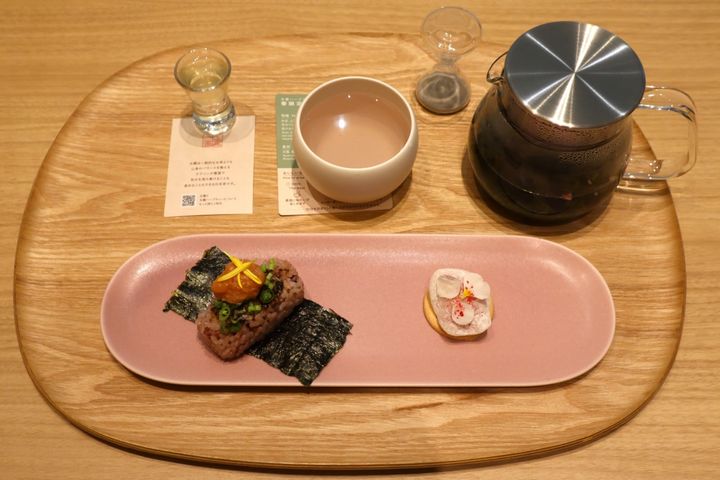 女性人気の高い「マグロ・たくあん・のり(300円)」の小さなおにぎりには山本山の海苔とふわふわのマグロが使用されており、ほっとする味わいが玉露ハーブティーともよく合います。体に優しい十六穀米も◎