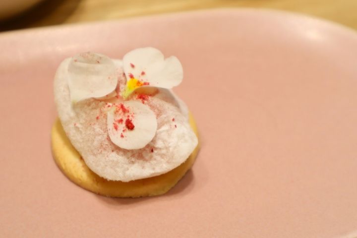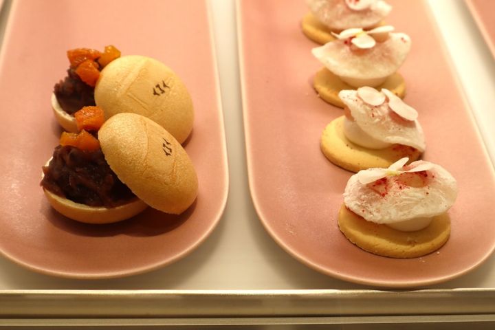 和スイーツの「白あんとベリー(450円)」は、桜の花びらが飾られたかわいらしい一品。もちもちの生地で白あんが包まれており、あんの優しい甘さとベリーの甘酸っぱさに春を感じます。