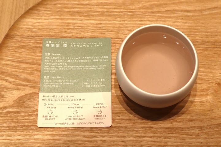 筆者は春限定の「玉露ハーブティー 苺」をチョイス。玉露に苺、ローズヒップ、ハイビスカスを合わせたベリー系の味わいで、ローズが華やかに香ります。玉露のまろやかな味わいが優しくハーブの香りをまとめているので、ハーブと玉露の調和をゆったりと楽しむことができました。