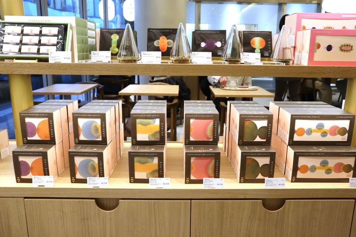 カフェには物販も併設されており、商品購入のみの利用ももちろんOK。アメリカのデザイナー、Michelle Armasさんが実際の玉露ハーブティーからインスピレーションを得て描いたというデザインは、玉露の味わいが持つ丸みが伝わるあたたかなものばかり。優しい気持ちを伝えたい人へのギフトにもおすすめです。