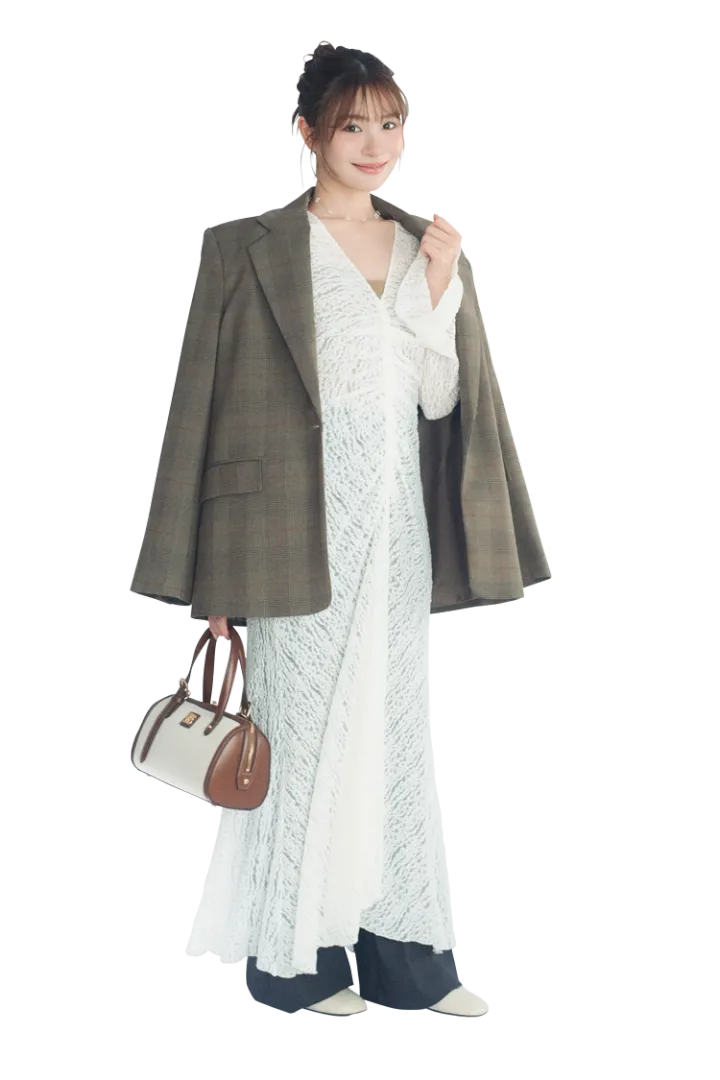 ジャケットやスラックスを仕込むことで、いつものワンピースコーデにコンサバ感をプラス。