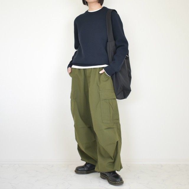 「グリーン・カーキ」系もネイビーと相性がよく、おしゃれに見えるボトムスの色です。例えば鮮やかなグリーンであれば、ネイビー合わせでちょっとレトロな雰囲気を作ることができます。スナップでは、ホワイト小物を添えて抜け感もプラス。