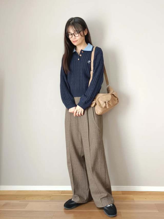 次にご紹介するのは「ベージュ・ブラウン」系のボトムスを合わせたネイビートップスコーデ。黒ほど重くならず落ち着いた印象を作ってくれるネイビーは、ナチュラルカラーとも相性バツグン!