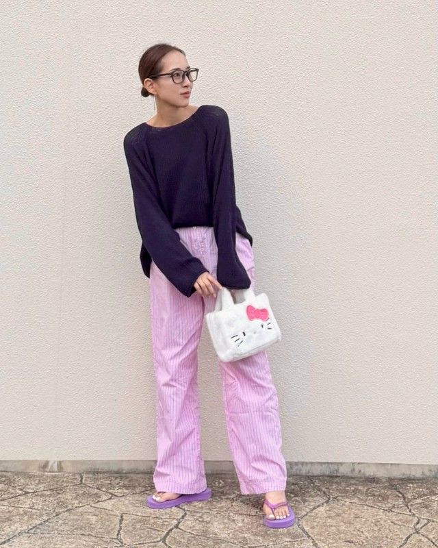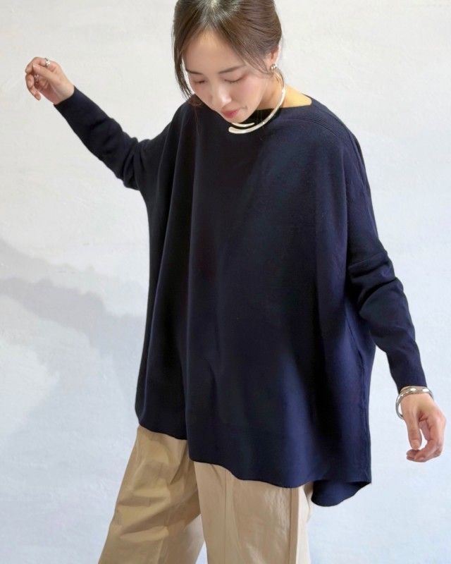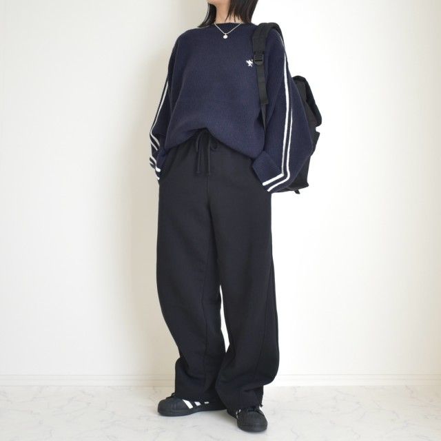 スナップではスウェットパンツを合わせてカジュアルに。ここでもネイビーの上品さがコーデを大人っぽく引き上げてくれていますね。