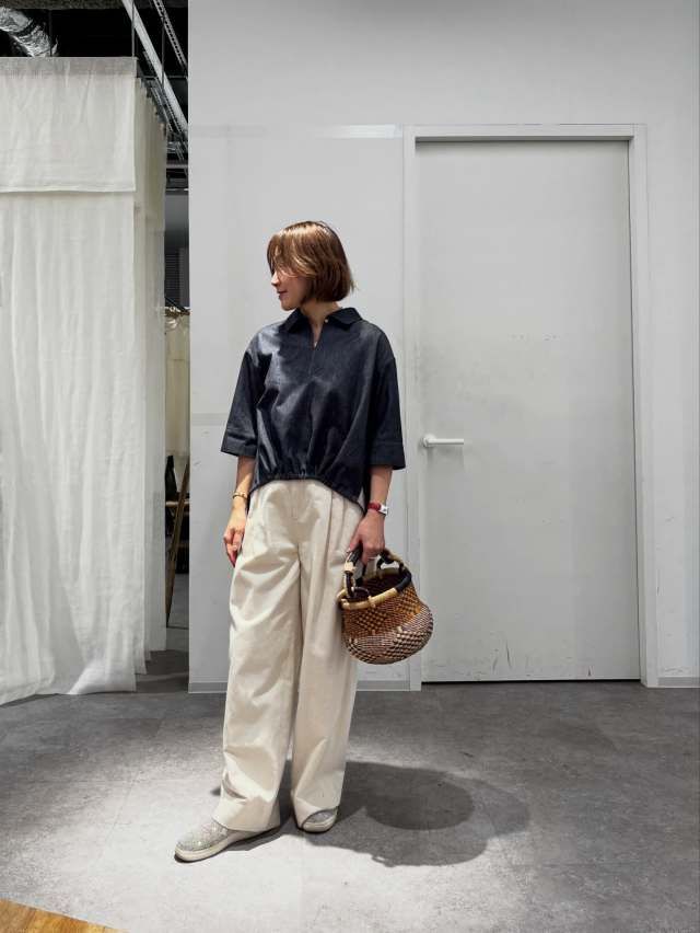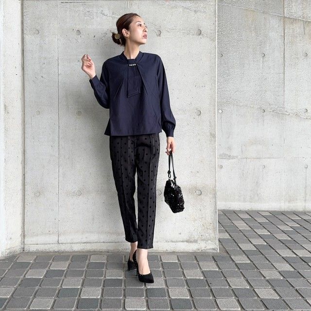 ネイビーブラウスとセンタープレスパンツを合わせれば、オンシーンでも着こなせるきれいめスタイルにシフトします。品のよさが際立つ落ち着いた配色がステキですよね。