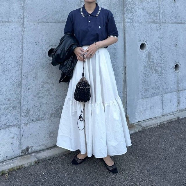 スナップでは、ネイビーのポロシャツに真っ白なフレアスカートをプラス。ボリューミーなスカートも軽やかですよね。