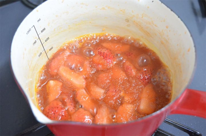 5分煮込んだ時点で、いちごが柔らかく煮えてきました。