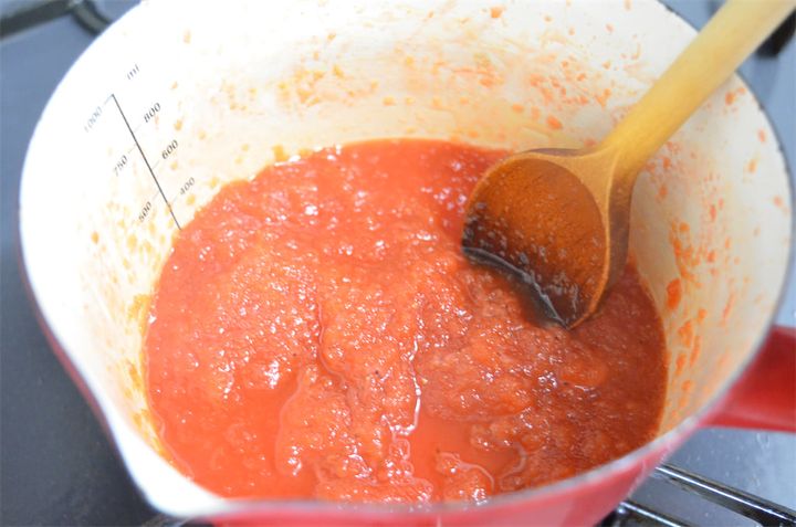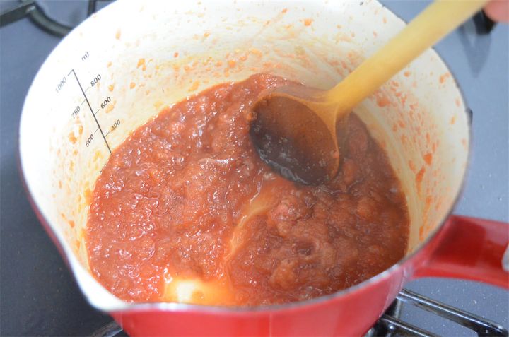 4. 弱火で煮る。煮詰まってくると焦げやすいので、耐熱のシリコンベラや木ベラで混ぜる。