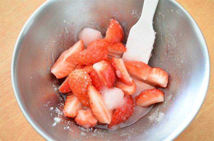 1. いちごを4等分に切って、砂糖となじませて30分ほどおき、水分が出てくるのを待つ。