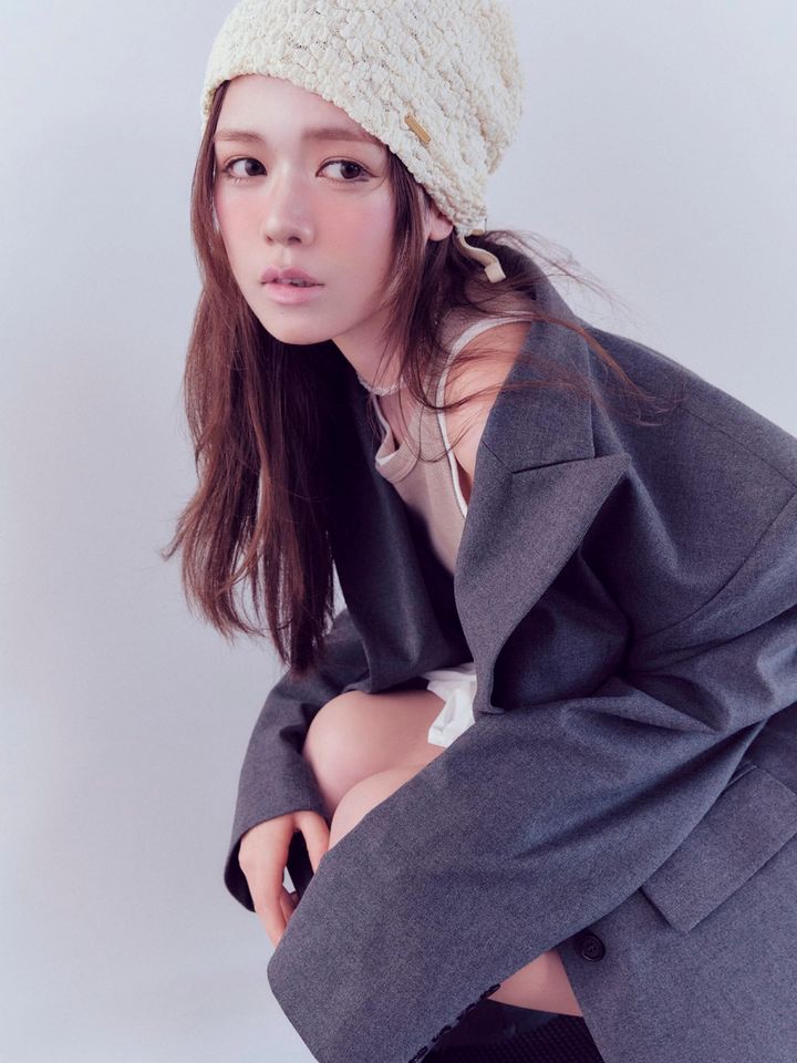 ジャケット¥41,140(ETHOS/HANA KOREA)、セットタンク3,190(HANNE/アンティローザ)、スカート¥17,600(HONEY MI HONEY)、ビーニー¥5,500(カオリノモリ/OVERRIDE ルミネエスト新宿)、チョーカー¥17,600(IRIS 47/Hooves)