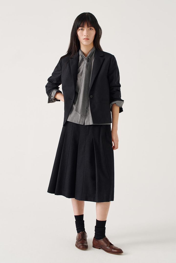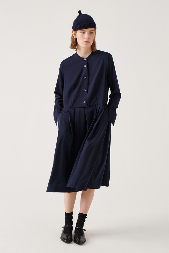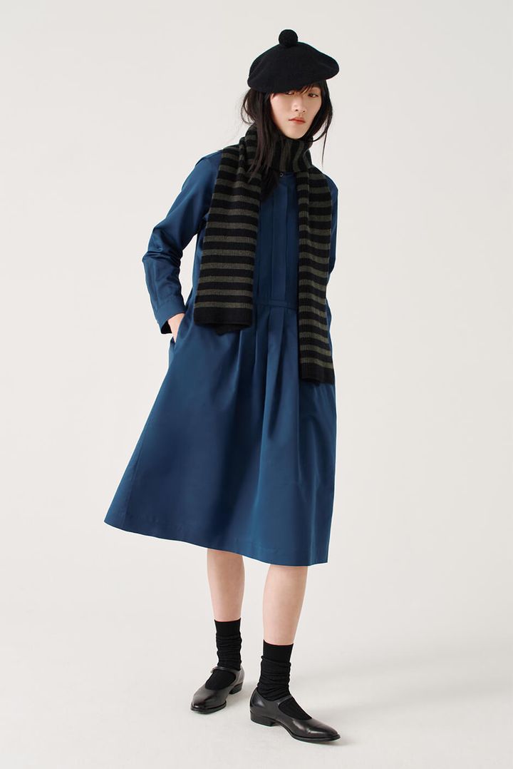 ドレスやスカートには、手縫いのプリーツやアーカイブに着想を得たラッフル、カーブした襟が取り入れられ、コットンシルクやポプリン、ウールリネンといった素材、ネイビーやカーキ、ストームグレー、ミネラルトーンの抑制された色調に奥行きを与える。