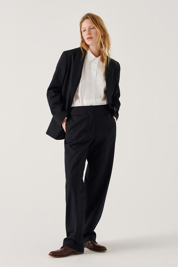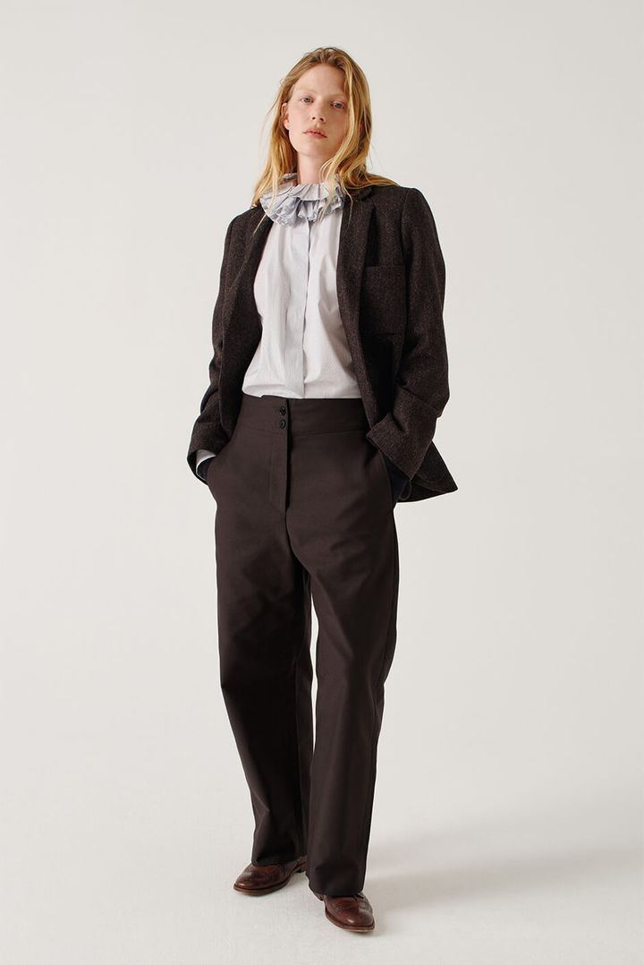 アンコンストラクテッドのドライウールブレザーや、テーパードシルエットのウールコットントラウザー、ポプリンのドレスシャツを合わせることで、端正なマスキュリニティを描く。
