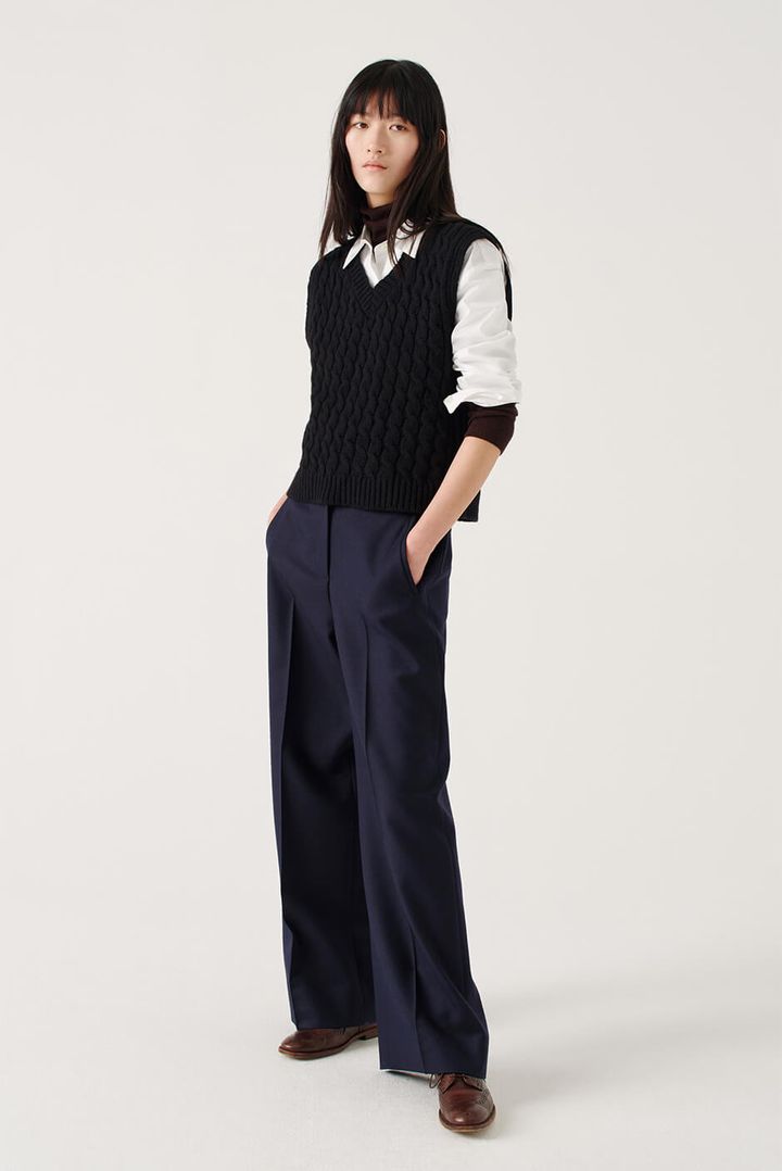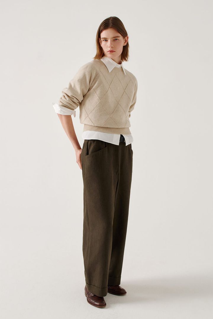 ニットウェアもコレクションの重要な構成要素となり、ソフトスパンウールのフィッシャーマンニットや、メリノカシミヤのストライプクルー、モダナイズされたフェアアイルが、暖かさと質感、汎用性を備える。