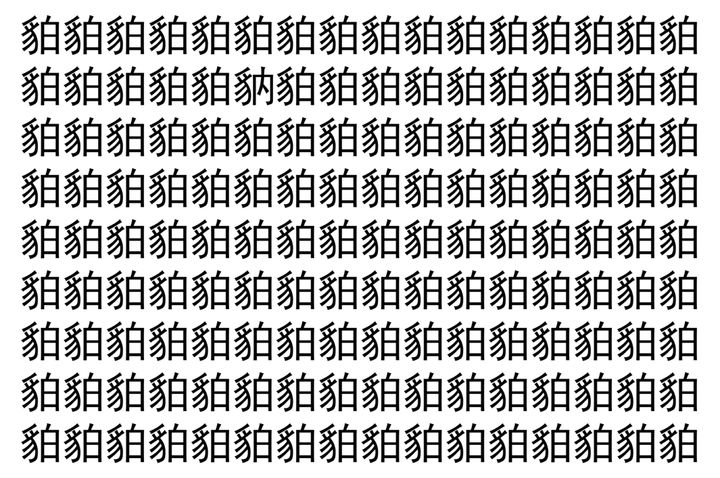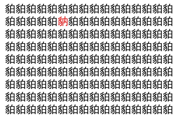 画像の中には、「貃」という漢字が縦に9行、横に16個並んでいます。 全部で144個となりますが・・・、そのうち1つは「異なる漢字」となってますよ!!