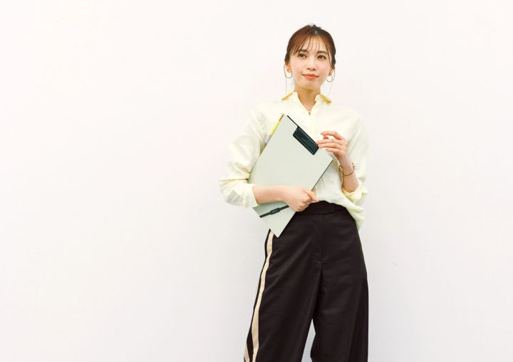 リネンシャツ¥3,990/UNIQLO ワイドパンツ¥9,900/MANGO スクエアトウパンプス¥9,990/PLST 時計¥25,300/マトウ(エイチエムエスウォッチストア表参道) パールネックレス¥2,640/アネモネ、フープイヤリング¥3,300/mimi33(ともにサンポークリエイト)