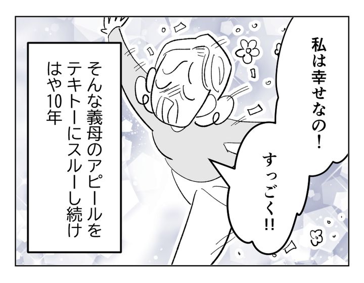 お義母さんの幸せアピールを、イラっとしつつも10年間スルーし続けたアリサさん。もちろん必然的に会う回数を減らしたと言っても、なかなかしんどいですよね。それでも自分の人生をしっかりと生きているアリサさん。芯の強い女性なんですね。しかしそんなアリサさんも、いよいよ限界を迎えたようです。お義母さん、いい加減その「幸せアピール」やめていただけませんか???