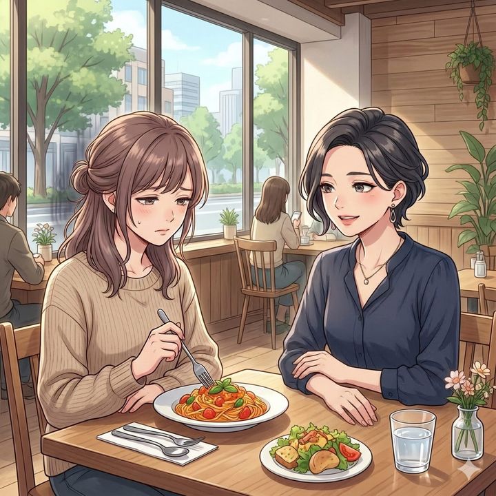 目の前には美しい盛り付けのトマトクリームパスタがあるというのに、彼女の終わらないマウント攻撃のせいで、口に入れても全く美味しさを感じられません。