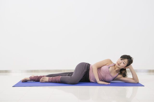 息を吐きながら、下側の脚をまっすぐのまま持ち上げます。脚先ではなく“脚の付け根”から引き上げる意識で。腰が浮いたり、体がぐらついたりしない高さで止めるのがポイントです。一度止めたあと、吸う息に合わせてゆっくり元の位置へ戻します。力を抜いて落とすのではなく、内ももでコントロールしながら下ろすこと。5回を目安に、反対側も同様に行います。