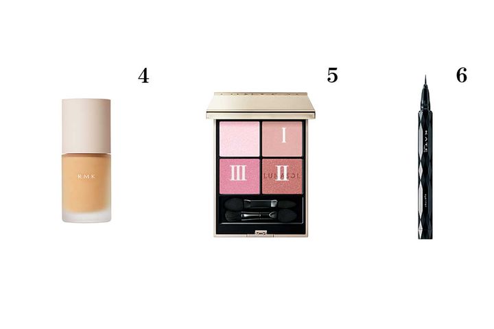 4.RMK リクイドファンデーション フローレスカバレッジ プラス SPF22・PA++ 102 ¥6,600 5.ルナソル アイカラーレーションN EX14 ¥7,700(限定) 6.ケイト スーパーシャープライナーEX4.0(ショート筆) BK-1 ¥1,430(編集部調べ)/カネボウ化粧品