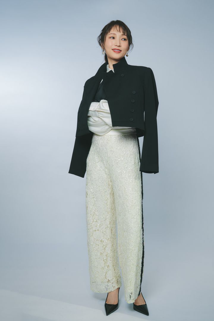 ジャケット(ALLSAINTS)ブラウス(レジーナ・ロマンティコ)パンツ(ローレン ラルフローレン)イヤリング(アビステ)靴(MANGO)