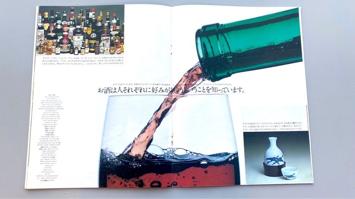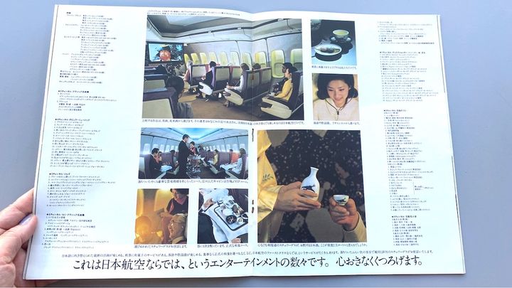 『心なごむ和服姿のスチュワーデスが、お酌する日本酒。ここが高度1万メートルと思えるでしょうか』invitation to First classより